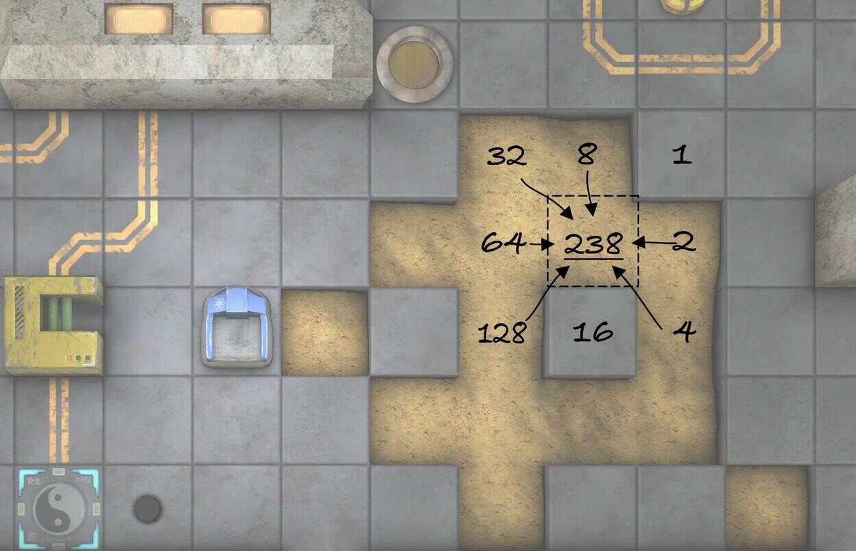 So it knows where to put the shadows, the fragment shader reads an adjacency map. This is an 8-bit integer for each tile, with one bit per neighbouring direction.