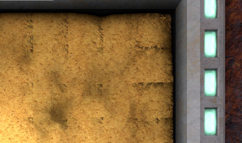 Each sand tile uses the same model: a subdivided plane. A vertex shader moves the vertices of this plane around to give it a bumpy surface, and a fragment shader adds the shadows around the edges where the sand tiles butt onto other tiles1.