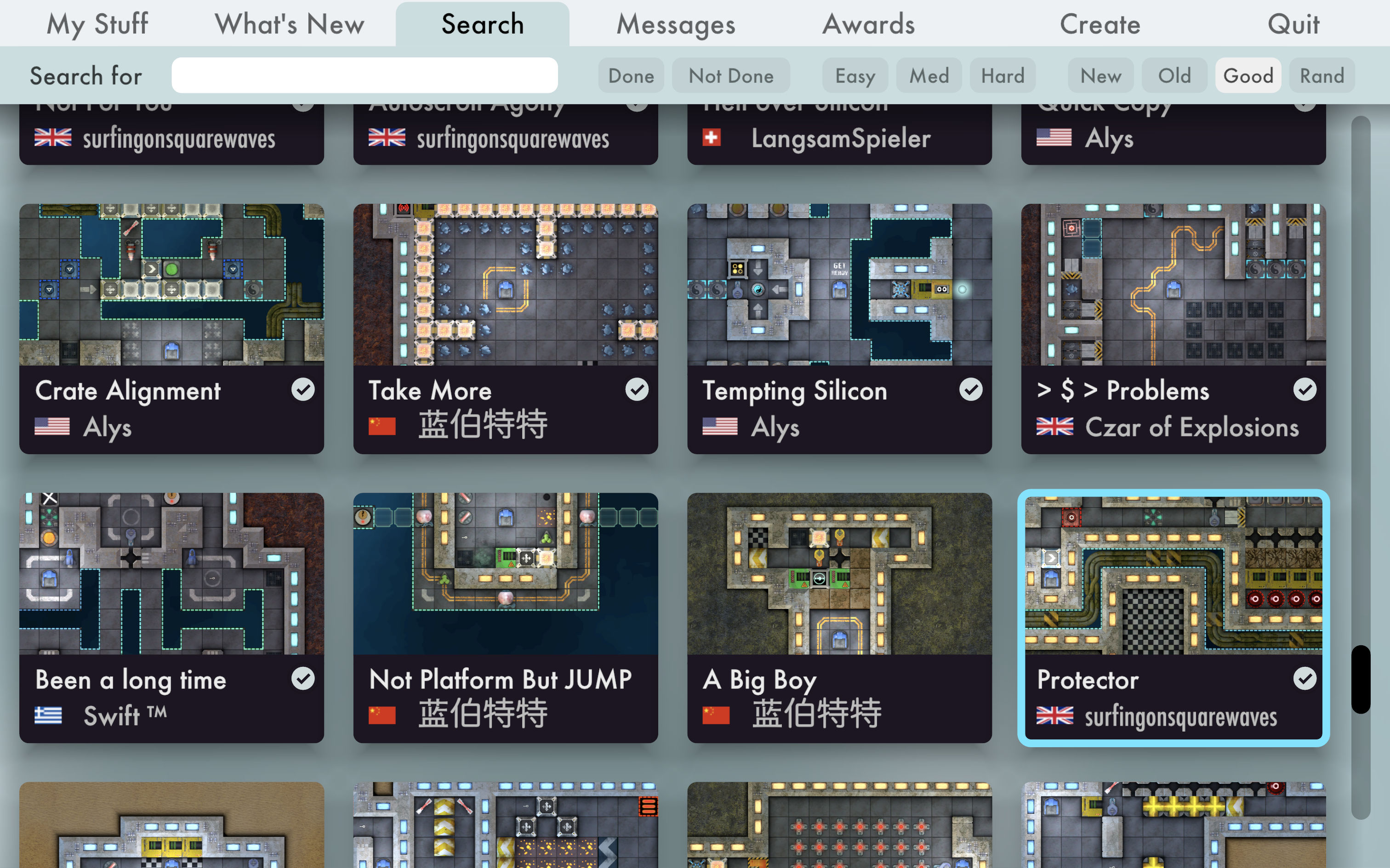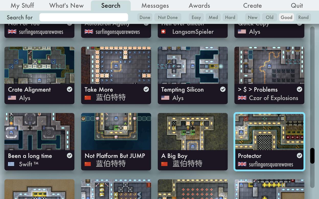 Secondly, I checked the Level Pit Previews. In the Level Pit GUI, Blackshift renders previews of the levels people upload which you can look at before you decide which one to play. These previews are rendered a bit differently from normal gameplay frames, so they can sometimes make a good test case; if a bug appears on the normal render but not the preview render, or vice-versa, then the differing render techniques can suggest what might be going wrong.