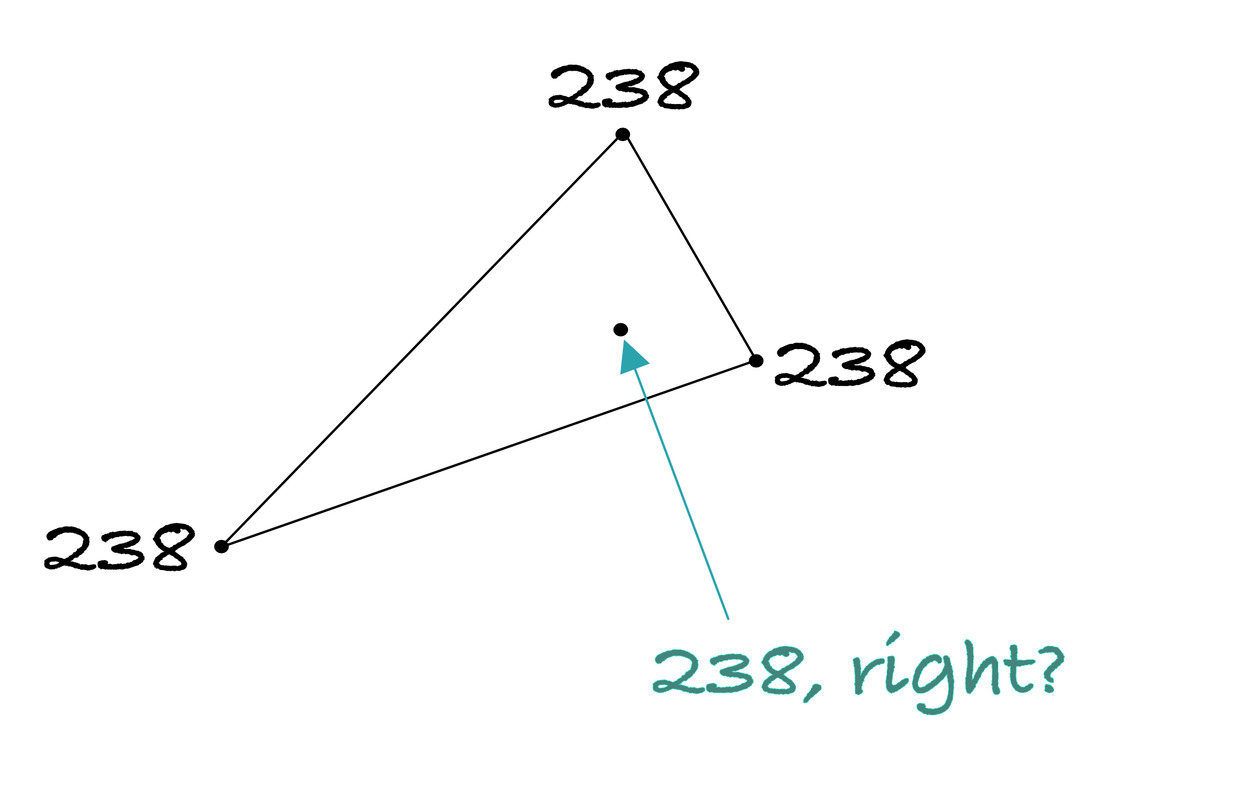 But when GPUs do this interpolation, they do it in a perspective-correct fashion, which involves dividing by the depth of each fragment and then multiplying again at the end5, and—hand-waving a bit, I know—this can cause numeric imprecision to creep in. I suppose my GPU is clever enough to notice that all three points of the triangle have the same value, and skip all the calculations, but these players' GPUs aren't doing that. They're doing all those perspective divides and multiplies, and getting those very-slightly-off float values.